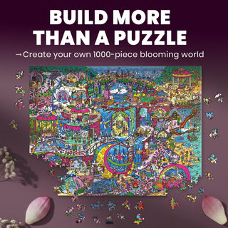 The QUOKKA Blush Lotus Kingdom 1,000 Piece Jigsaw Puzzle features vibrant illustrations, hidden objects, and 223 secrets to solve—making it an ideal challenge for adult puzzle fans.
