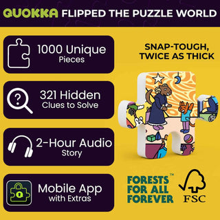 The QUOKKA Desert Whirl | 1,000 Piece Jigsaw Puzzle offers adults a vibrant, chaotic desert scene with a giant megaphone, 321+ secrets to uncover, and a 2-hour immersive story—all packed in one mysterious box.