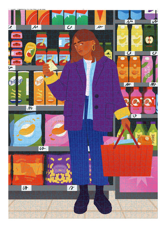 The Quoi D'autre ? 500 piece jigsaw puzzle by Holiyay Puzzles features luminous artwork of a person before colorful grocery store shelves set against a light purple background.