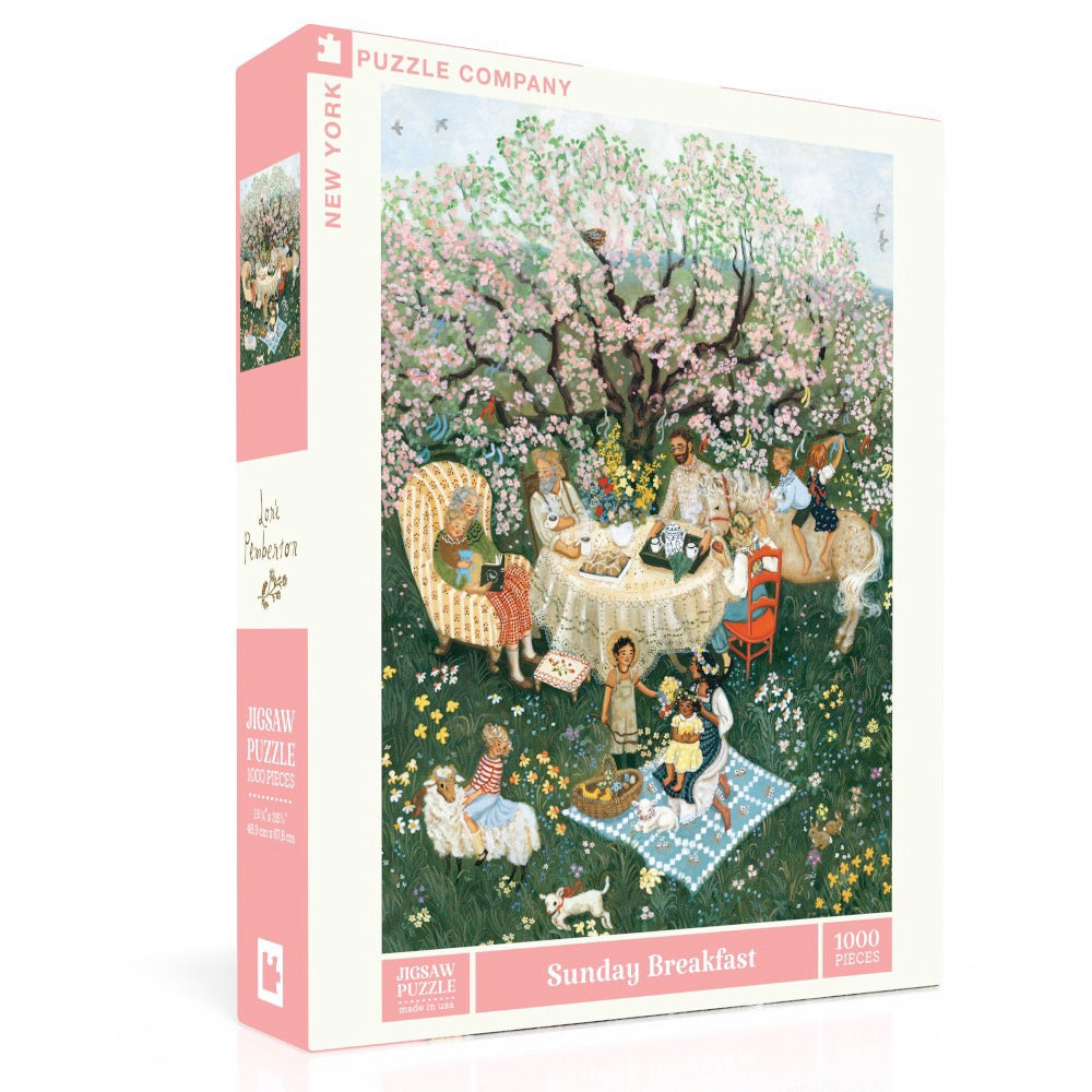 A moment of togetherness unfolds in Sunday Breakfast, a 1000 piece jigsaw puzzle illustrated by Loré Pemberton. Set beneath a beautiful, sprawling tree, the scene brings together a group of people who appear to span several generations, all gathered around the table to enjoy a leisurely breakfast.