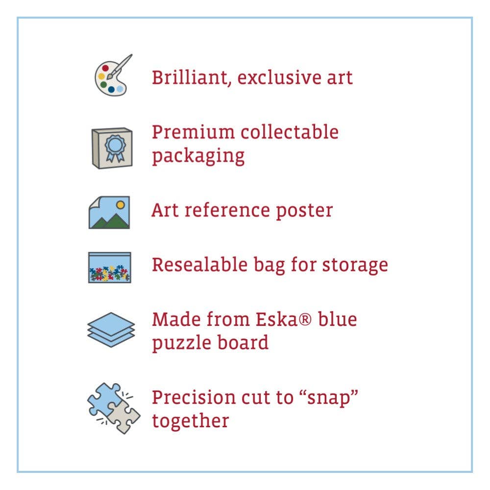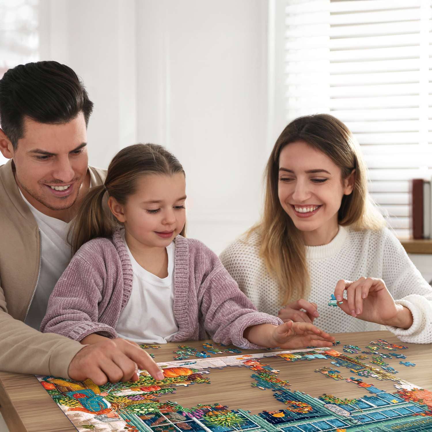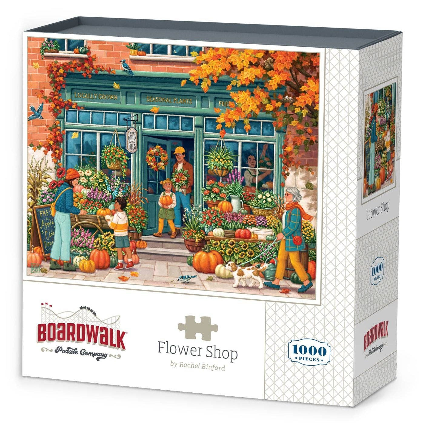 Flower Shop by Rachel Binford Step into autumn’s cozy charm with our Flower Shop puzzle. This delightful scene brings to life a quaint flower shop decked out for fall. You’ll find multi-colored pumpkins as well as vibrant, chrysanthemums, sunflowers, dahlias, corn stalks, and rustic dried grasses. This is the perfect way to relax and warm your soul as you piece together. Flower Shop is part of our Iconic Places Collection. Boardwalk traditional puzzles are proudly manufactured in the U.S.A. from domestic and imported materials. Our jigsaw puzzles are made with premium Eska® puzzle blue board produced from 100% recovered paper. Each puzzle comes in a collectable box with magnet close, includes a full-color reference poster, and contains resealable bag for puzzle storage. Boardwalk traditional puzzles are precision cut to fit tightly and “snap” together.