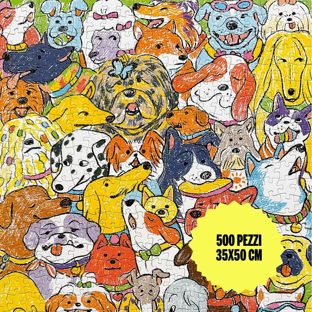 After the success of our cat puzzle, we couldn't stop there. For months we worked on Mischievous Puppies, a 500-piece puzzle featuring funny and amusing puppies (yes, "birichini" is spelled with an "s" if that's what you're asking). The dogs depicted in the puzzle are numerous and all different, illustrated with pastel colors, making the scene harmonious and pleasant to look at. Many of them wear playful accessories like glasses, bows, bandanas, and colorful collars that add a touch of charm and liveliness to the image. The final result is a sunny puzzle, full of character and capable of immediately putting anyone in a good mood.
