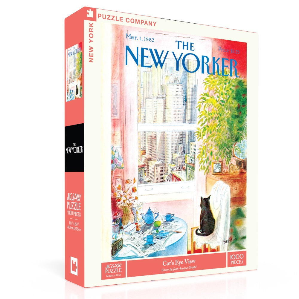 Bring a touch of feline charm to your puzzle collection with Cat’s Eye View, a bestselling 1000-piece jigsaw puzzle that perfectly captures the essence of New York City. In this whimsical New Yorker cover by artist Jean-Jacques Sempé from March 1982, a thoughtful black cat perches on a chair in a New York apartment, gazing out over a table set for tea and taking in the mesmerizing city skyline.