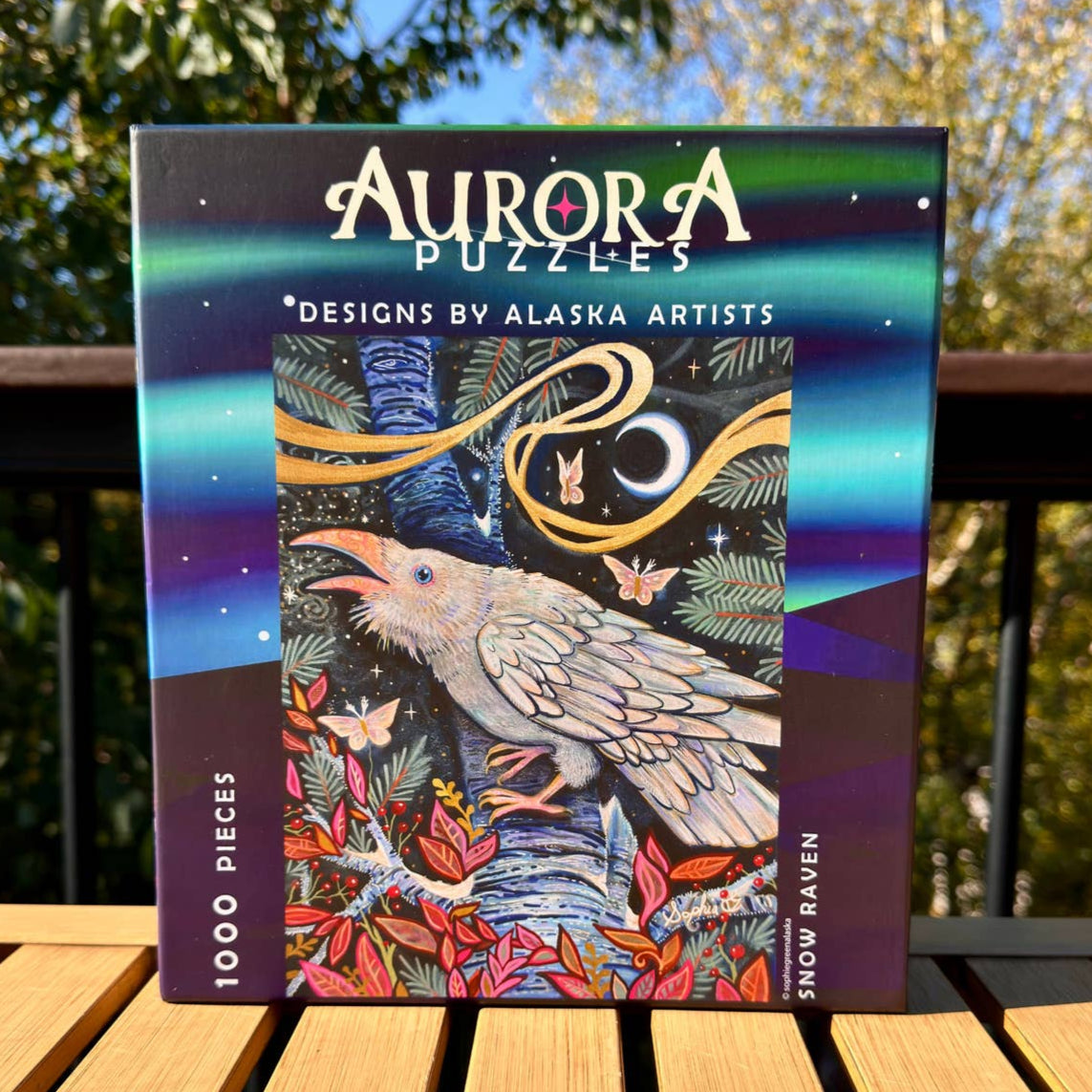 The Alaska Snow Raven perches on a majestic spruce under the silvery glow of the moon; his white feathers stand out amongst the bright leaves and berries while shimmering butterflies dance around him.