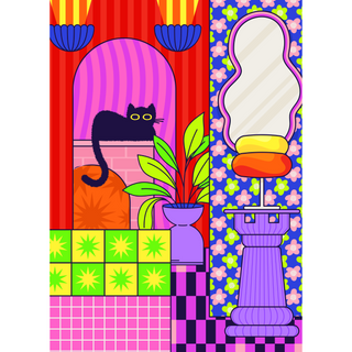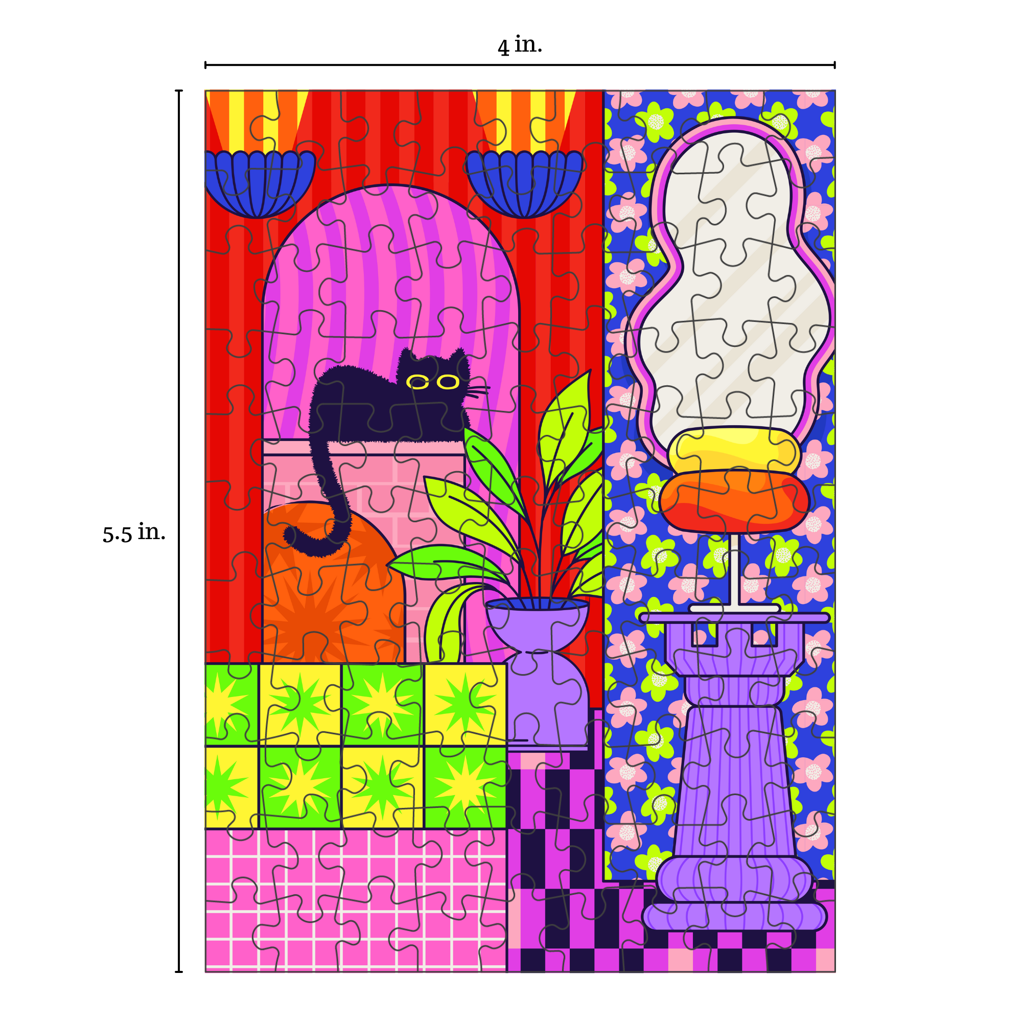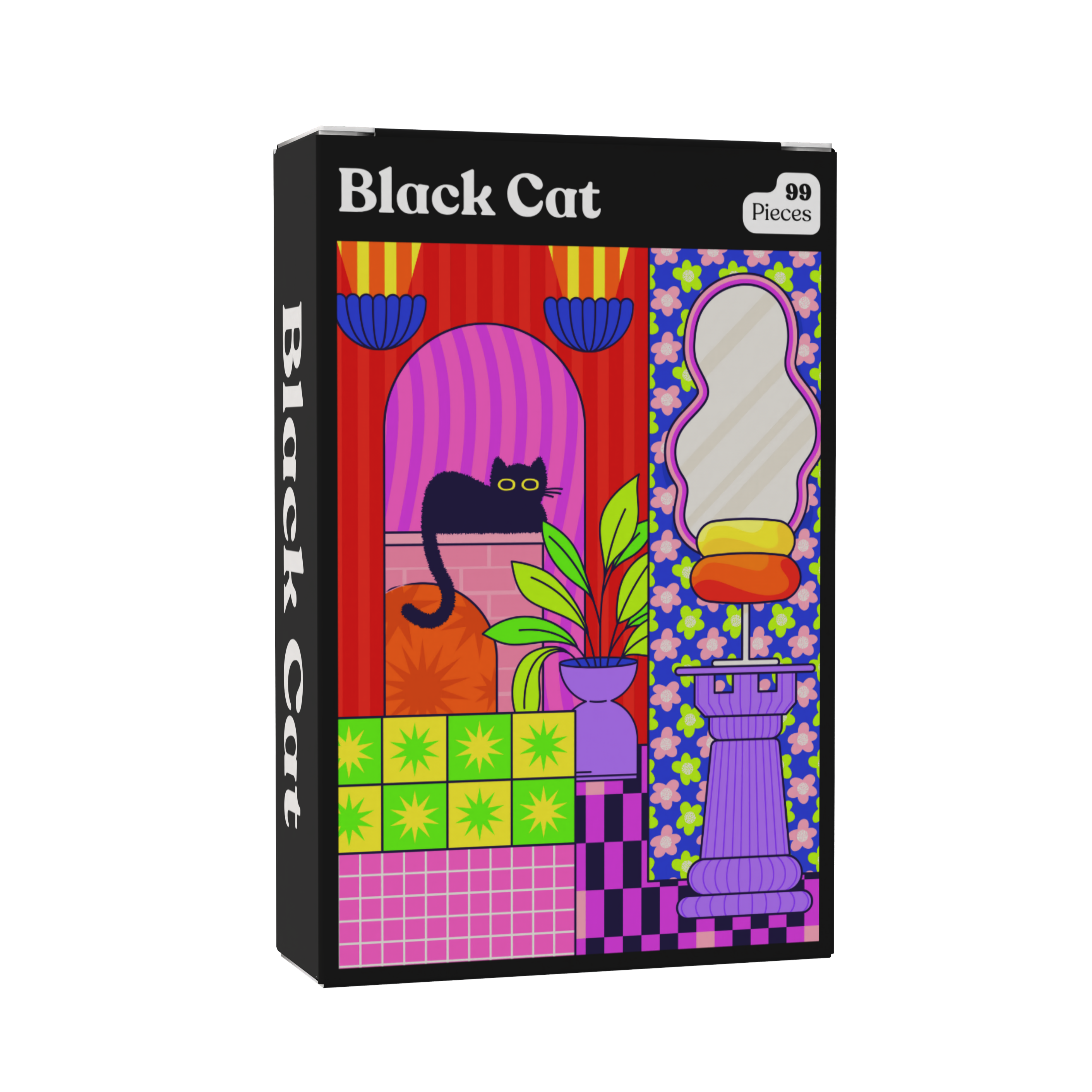 Invite a bit of feline flair into your tiny puzzle collection with this 99-piece pocket puzzle—just 4″ × 5.5″ when assembled—featuring a sleek black cat perched in a riot of color and pattern.