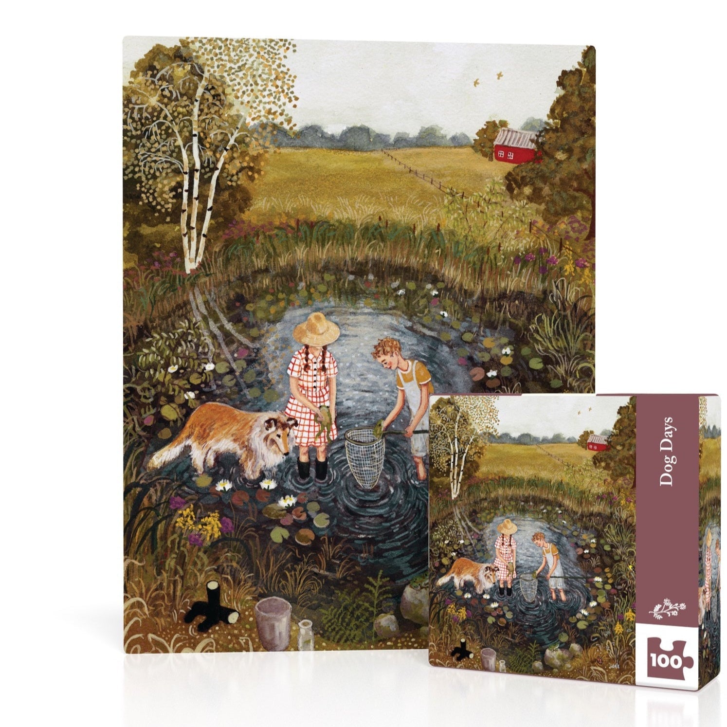 Immerse yourself in the charm of a warm summer day with the "Dog Days" Mini Puzzle, illustrated by renowned artist Loré Pemberton. This delightful puzzle captures the essence of childhood and nature, depicting a young boy and girl catching frogs in a serene pond, surrounded by lily pads and lush swampy greenery. Their loyal collie stands watch nearby, adding a sense of companionship to the tranquil scene. In the distance, expansive fields stretch toward a vibrant red barn, completing this idyllic country setting.